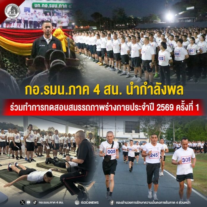 วันนี้ ( 30 มกราคม 2569 ) เวลา 06.00 น. ค่ายสิรินธร ตำบลเขาตูม อำเภอยะรัง จังหวัดปัตตานี พันเอก ปรีชา จันทคนางกูร รองเลขาธิการ กองอำนวยการรักษาความมั่นคงภายในภาค 4 ส่วนหน้า นำกำลังพลของกองอำนวยการรักษาความมั่นคงภายในภาค 4 ส่วนหน้า ร่วมทำการทดสอบสมรรถภาพร่างกายกำลังพลประจำปี 2569 ครั้งที่ 1 โดยได้ทำการทดสอบใน 3 สถานี ได้แก่ สถานีทดสอบดันพื้นละมือกางแขน, สถานีทดสอบท่ากระดานคว่ำ และ สถานีวิ่งระยะทาง 2 กิโลเมตร
