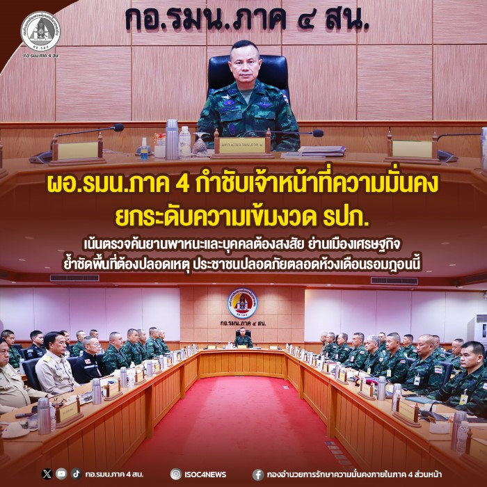 ทั้งนี้ กองอำนวยการรักษาความมั่นคงภายในภาค 4 ส่วนหน้า มุ่งมั่นดูแลพื้นที่ควบคู่การเพิ่มมาตรการเฝ้าระวังพื้นที่เป้าหมายอ่อนแอ ทั้งเขตเศรษฐกิจ สถานบันเทิง และระบบสาธารณูปโภค เพื่อรักษาความสงบเรียบร้อยและอำนวยความสะดวกให้ประชาชนปฏิบัติศาสนกิจอย่างเต็มที่ ให้เดือนรอมฎอนเป็นเดือนแห่งความบริสุทธิ์ ปราศจากเหตุรุนแรง และส่งเสริมการอยู่ร่วมกันอย่างสันติภายใต้สังคมพหุวัฒนธรรมอย่างยั่งยืนสืบไป