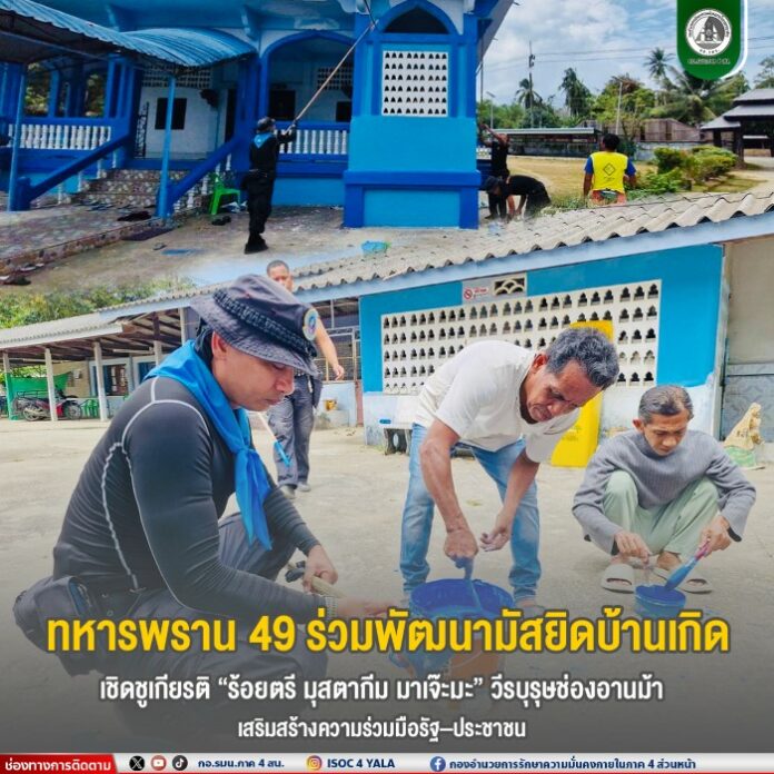 เมื่อวันที่ 30 มกราคม 2569 เวลา 14.00 น. หน่วยเฉพาะกิจกรมทหารพรานที่ 49 จัดกำลังพลชุดปฏิบัติการกิจการพลเรือน กองร้อยทหารพรานที่ 4911 ร่วมกับ ชุดสันติสุข, สมาชิกองอาสารักษาดินแดนชุดคุ้มครองตำบลดุซงญอ, ผู้นำท้องถิ่น ผู้นำศาสนา และประชาชนในพื้นที่ ร่วมกันดำเนินกิจกรรม ทาสีปรับปรุงมัสยิดคอยรียะห์ทั้งหลัง เพื่อพัฒนาสถานที่ประกอบศาสนกิจและศูนย์รวมจิตใจของชุมชน ณ มัสยิดคอยรียะห์ บ้านสุแฆ หมู่ที่ 3 ตำบลดุซงญอ อำเภอจะแนะ จังหวัดนราธิวาส เพื่อเชิดชูเกียรติและรำลึกถึงคุณงามความดีของ ร้อยตรี มุสตากีม มาเจ๊ะมะ “วีรบุรุษช่องอานม้า” ซึ่งมัสยิดแห่งนี้เป็นสถานที่ที่ท่านเคยใช้ประกอบศาสนกิจเมื่อครั้งยังมีชีวิตอยู่และกลับมาพำนักยังภูมิลำเนา อันสะท้อนถึงความผูกพันระหว่างบุคคลต้นแบบผู้เสียสละกับชุมชนท้องถิ่น