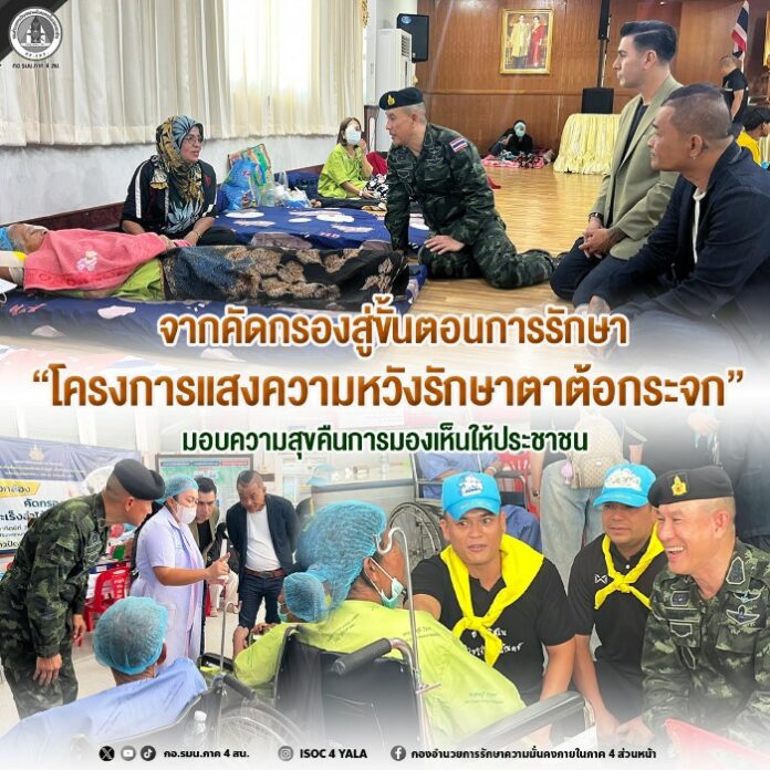 วันที่ 31 มกราคม 2569 ณ โรงพยาบาลสมเด็จพระยุพราชสายบุรี จังหวัดปัตตานี โครงการแสงความหวังรักษาตาต้อกระจก ดำเนินงานต่อเนื่องเป็นวันที่ 2 เข้าสู่ขั้นตอนการรักษาอย่างเต็มรูปแบบ หลังจากเสร็จสิ้นการคัดกรองในวันแรก เมื่อวันที่ 30 มกราคมที่ผ่านมา โดยมี พันเอก เอกธวุฒิ คงคาเขตร ผู้อำนวยการโรงเรียนการเมือง ศูนย์สันติวิธี และ พันเอก ณัฐวุฒิ ศรีสังข์ ผู้บังคับหน่วยเฉพาะกิจกรมทหารพรานที่ 44 นำกำลังพลจิตอาสาจาก กองพันทหารราบที่ 2 กรมทหารราบที่ 153 และชุดปฏิบัติการกิจการพลเรือน (ชาย/หญิง) หน่วยเฉพาะกิจกรมทหารพรานที่ 44 ลงพื้นที่อำนวยความสะดวกและให้กำลังใจประชาชน