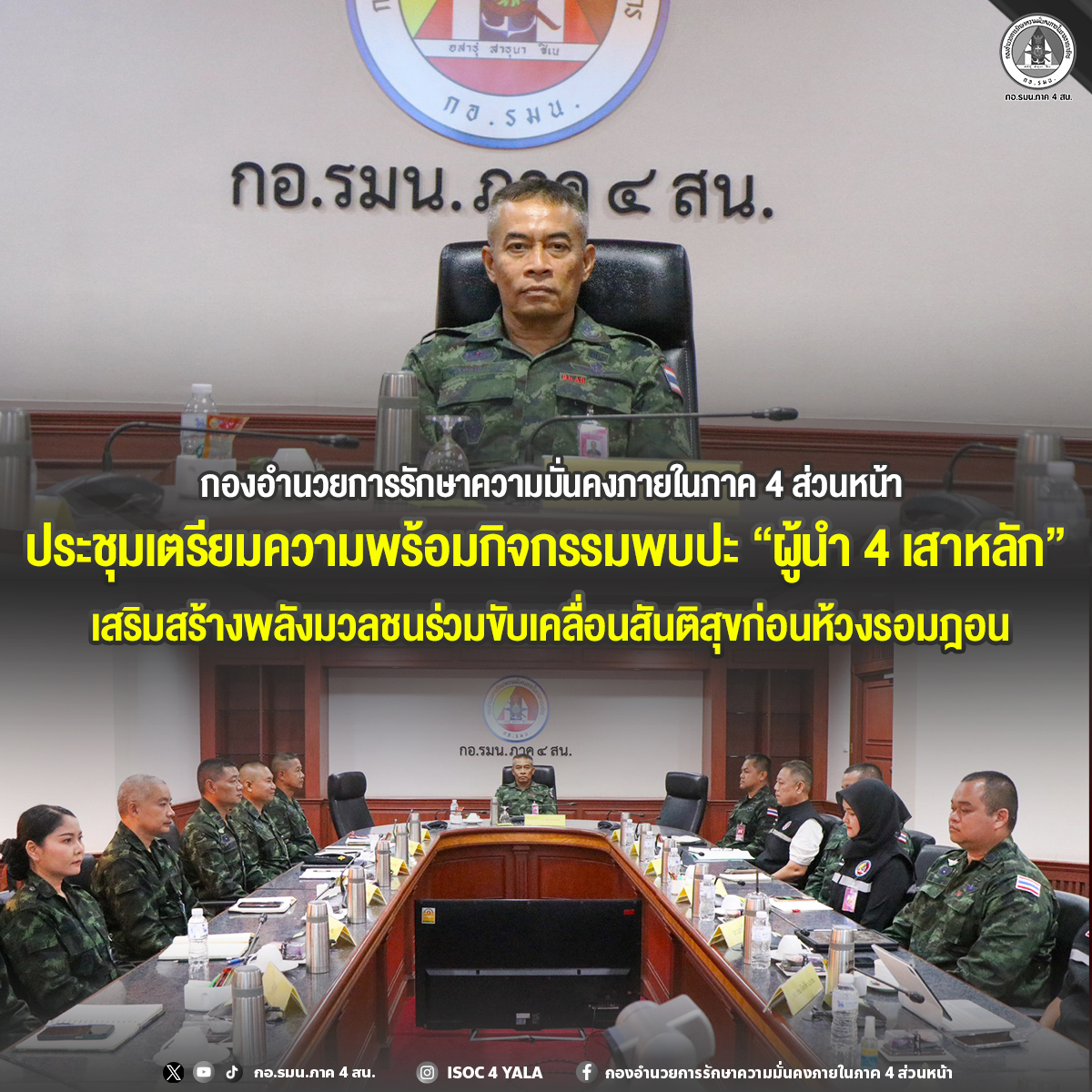 สำหรับการประชุมในครั้งนี้ เป็นการขับเคลื่อนตามนโยบายของ ผู้อำนวยการรักษาความมั่นคงภายในภาค 4 ที่มีดำริในการส่งเสริมความร่วมมือระหว่างภาครัฐและภาคประชาชน เพื่อสร้างความเข้าใจอันดีและขับเคลื่อนการพัฒนาพื้นที่จังหวัดชายแดนภาคใต้อย่างเป็นระบบ โดยมุ่งเน้นการเสริมสร้างบทบาทของผู้นำ 4 เสาหลัก ประกอบด้วย ผู้นำท้องที่, ผู้นำท้องถิ่น, ผู้นำศาสนา และผู้นำตามธรรมชาติ ซึ่งถือเป็นกลไกสำคัญที่มีบทบาทต่อความคิดความเชื่อ เป็นผู้ที่เข้าใจบริบทในพื้นที่อย่างแท้จริง และเป็นกำลังหลักในการสนับสนุนงานด้านความมั่นคง เพื่อร่วมกันคลี่คลายความขัดแย้งและสร้างสันติสุขให้เกิดขึ้นอย่างยั่งยืน