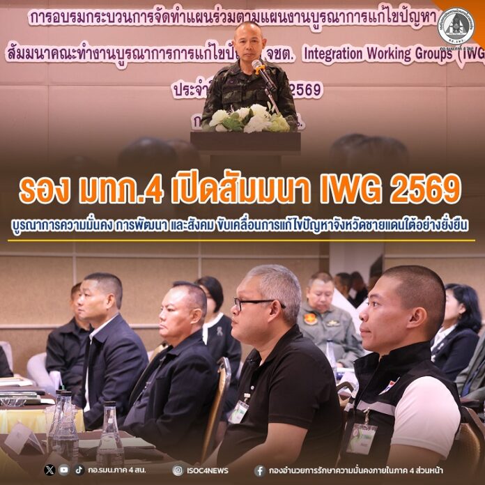 วันนี้ (3 กุมภาพันธ์ 2569) เวลา 11.40 น. ณ โรงแรมเซาท์เทิร์นแอร์พอร์ต อำเภอหาดใหญ่ จังหวัดสงขลา พลตรี ชาคริต อุจะรัตน รองแม่ทัพภาคที่ 4 / รองผู้อำนวยการรักษาความมั่นคงภายในภาค 4 ส่วนหน้า เป็นประธานพิธีเปิดการประชุมสัมมนากระบวนการจัดทำแผนร่วม ตามแผนงานบูรณาการกลไกการขับเคลื่อนคณะทำงานบูรณาการ การแก้ไขปัญหาจังหวัดชายแดนภาคใต้ (Integration Working Groups : IWG) ประจำปีงบประมาณ 2569 จัดขึ้นระหว่างวันที่ 3–6 กุมภาพันธ์ 2569 โดยมี นายนันทพงศ์ สุวรรณรัตน์ รองเลขาธิการ ศอ.บต. ,พลตรี อนุชา โนนคู่เขตโขง ผู้อำนวยการส่วนพัฒนายุทธศาสตร์ กอ.รมน.ภาค 4 สน., พลตำรวจตรี เสกสันต์ ชูรังสฤษฎิ์ หัวหน้าคณะทำงานฯ IWG 8 การยุติธรรมและสันติวิธี, พันเอก ขจรศักดิ์ ไทยประยูร ผู้อำนวยการศูนย์ประเมินผล กอ.รมน.ภาค 4 สน.,พันเอก วีรศรุตธ์ ประดิษฐสุวรรณ รองผู้อำนวยการกองนโยบายและแผน สำนักอำนวยการข่าวกรอง กอ.รมน.ภาค 4 สน.,นางสาวนภัสนันท์ ทรัพย์เจริญ รองผู้อำนวยการศูนย์ขับเคลื่อนการศึกษาในจังหวัดชายแดนภาคใต้ ,พันเอกหญิง รัจนาพร ปาลี หัวหน้าแผนกประสานนโยบายและยุทธศาสตร์ส่วนพัฒนายุทธศาสตร์ กอ.รมน.ภาค 4 สน. และคณะทำงาน IWG จากหน่วยงานด้านความมั่นคง การพัฒนา และการศึกษา ตลอดจนเจ้าหน้าที่ที่เกี่ยวข้องเข้าร่วมสัมมนาฯ