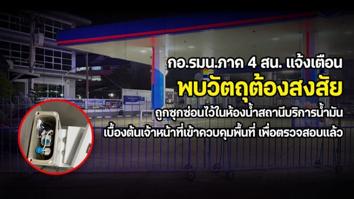กองอำนวยการรักษาความมั่นคงภายในภาค 4 ส่วนหน้า ขอแจ้งให้ประชาชนในพื้นที่จังหวัดปัตตานีและพื้นที่ใกล้เคียงทราบว่า เมื่อวันที่ 3 กุมภาพันธ์ 2569 เวลาประมาณ 18.35 น. เจ้าหน้าที่ได้รับแจ้งจากพลเมืองดีว่าพบวัตถุต้องสงสัย ภายในห้องน้ำของสถานีบริการน้ำมัน ปตท. บริเวณวงเวียนหอนาฬิกา ตำบลสะบารัง อำเภอเมือง จังหวัดปัตตานี และ บริเวณห้องน้ำสถานีบริการน้ำมัน ปตท. ปัตตานีคอนกรีต ตำบลรูสะมิแล อำเภอเมือง จังหวัดปัตตานี ขณะนี้เจ้าหน้าที่ได้เข้าควบคุมพื้นที่และดำเนินการตรวจสอบตามขั้นตอนด้านความปลอดภัยอย่างเคร่งครัดแล้ว เพื่อป้องกันอันตรายที่อาจเกิดขึ้นกับประชาชน