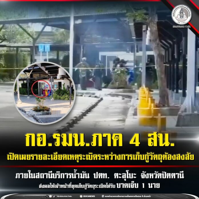 กองอำนวยการรักษาความมั่นคงภายในภาค 4 ส่วนหน้า รายงานความคืบหน้ากรณีเหตุระเบิดภายในสถานีบริการน้ำมัน ปตท. ริมถนนสาย 410 ปัตตานี – ยะลา ตำบลตะลุโบะ อำเภอเมือง จังหวัดปัตตานี ซึ่งเกิดขึ้นเมื่อช่วงเช้าของวันที่ 4 กุมภาพันธ์ 2569 หลังจากเจ้าหน้าที่หน่วยทำลายวัตถุระเบิด หรือ อีโอดี ได้เข้าดำเนินการตรวจสอบพื้นที่อย่างละเอียดภายหลังได้รับแจ้งเหตุพบวัตถุต้องสงสัย
