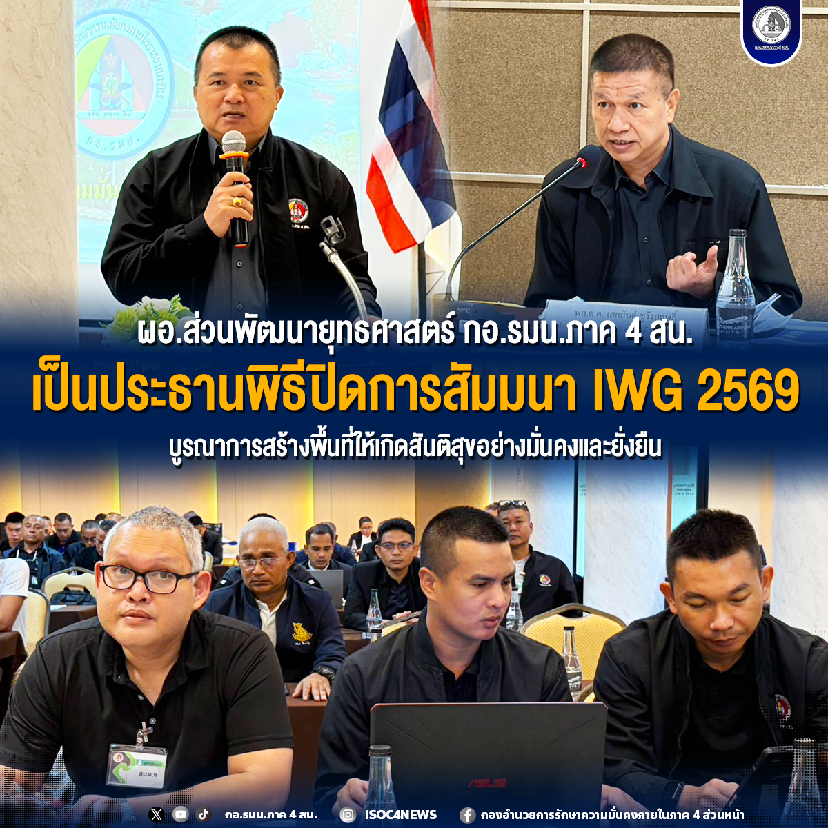 วันนี้ (4 กุมภาพันธ์ 2569) เวลา 11.00 น. ณ โรงแรม เซาท์เทิร์นแอร์พอร์ต อำเภอหาดใหญ่ จังหวัดสงขลา พลตรี อนุชา โนนคู่เขตโขง ผู้อำนวยการส่วนพัฒนายุทธศาสตร์ กองอำนวยการรักษาความมั่นคงภายในภาค 4 ส่วนหน้า เป็นประธานพิธีปิดการประชุมสัมมนากระบวนการจัดทำแผนร่วม ตามแผนงานบูรณาการกลไกการขับเคลื่อนคณะทำงานบูรณาการการแก้ไขปัญหาจังหวัดชายแดนภาคใต้ (Integration Working Groups : IWG) ประจำปีงบประมาณ 2569 โดยมี พลตำรวจตรี เสกสันต์ ชูรังสฤษฎิ์ หัวหน้าคณะทำงานฯ IWG 8 ด้านการยุติธรรมและสันติวิธี, พันเอก ขจรศักดิ์ ไทยประยูร ผู้อำนวยการศูนย์ประเมินผล กอ.รมน.ภาค 4 สน., พันเอก วีรศรุตธ์ ประดิษฐสุวรรณ รองผู้อำนวยการกองนโยบายและแผน สำนักอำนวยการข่าวกรอง กอ.รมน.ภาค 4 สน. และคณะทำงาน IWG จากหน่วยงานด้านความมั่นคง การพัฒนา และการศึกษา ตลอดจนเจ้าหน้าที่ที่เกี่ยวข้องเข้าร่วม