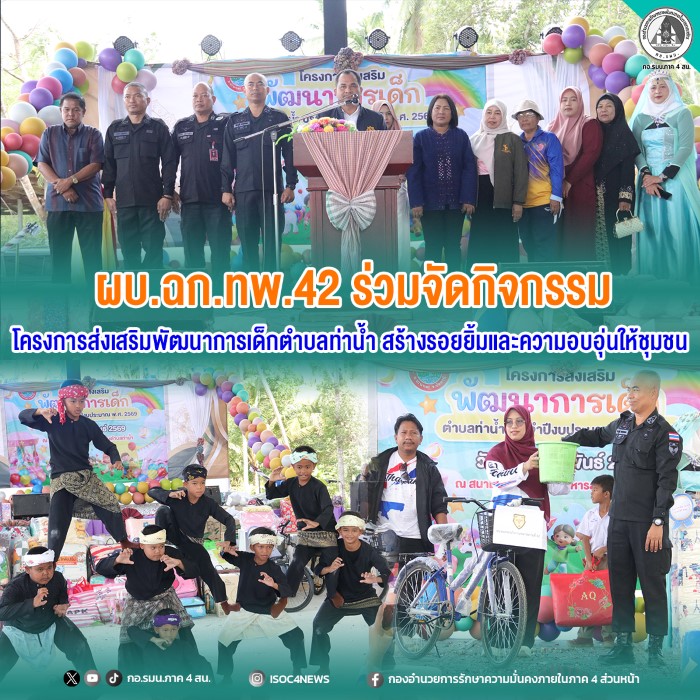 วันที่ 3 กุมภาพันธ์ 2569 เวลา 09.00 น. พันเอก ชัยวุฒิ พรมทอง ผู้บังคับหน่วยเฉพาะกิจกรมทหารพรานที่ 42 นำกำลังพลจากกองร้อยทหารพรานที่ 4210 และชุดปฏิบัติการกิจการพลเรือน หมวดทหารพรานหญิง ร่วมบูรณาการกับส่วนราชการในพื้นที่ จัดกิจกรรม โครงการส่งเสริมพัฒนาการเด็กตำบลท่าน้ำ ณ องค์การบริหารส่วนตำบลท่าน้ำ อำเภอปะนาเระ จังหวัดปัตตานี โดยมี นายจอน สุกป่าน นายอำเภอปะนาเระ เป็นประธานในพิธี