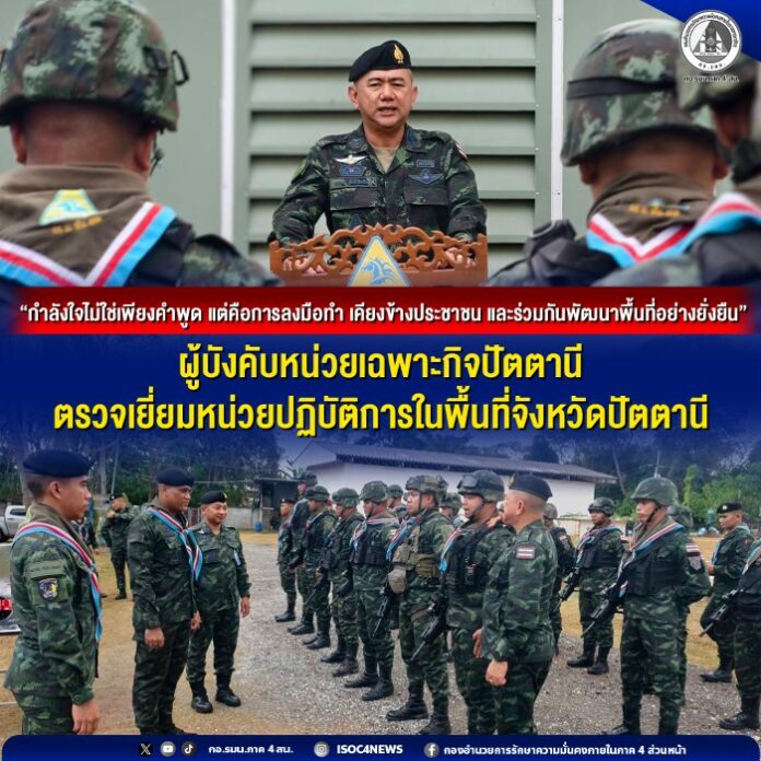 เมื่อวันที่ 4 กุมภาพันธ์ 2569 เวลา 14.00 น. พลตรี ณรงค์ ตันติสิทธิพร ผู้บังคับหน่วยเฉพาะกิจปัตตานี พร้อมด้วยคณะฝ่ายอำนวยการหน่วยเฉพาะกิจปัตตานี ลงพื้นที่ตรวจเยี่ยมหน่วยปฏิบัติการในพื้นที่รับผิดชอบ เพื่อรับฟังบรรยายสรุปผลการดำเนินงาน ติดตามสถานการณ์ในพื้นที่อย่างใกล้ชิด ตลอดจนรับทราบปัญหา อุปสรรค และข้อเสนอแนะจากผู้ปฏิบัติงานในพื้นที่จริง เพื่อให้การดำเนินงานด้านความมั่นคงเป็นไปอย่างสอดคล้องกับบริบทของชุมชน และสามารถตอบสนองต่อความต้องการของประชาชนได้อย่างแท้จริง โดยมี พันโท อยุทธ์ รุ่งเรือง ผู้บังคับหน่วยเฉพาะกิจกองพันทหารม้าที่ 31 ให้การต้อนรับ