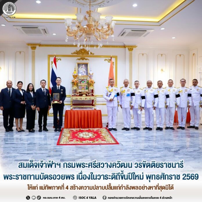 เมื่อวันที่ 5 กุมภาพันธ์ 2569 เวลา 08.00 น. ณ ห้องหาญ ลีนานนท์ กองบัญชาการกองทัพภาคที่ 4 ค่ายวชิราวุธ จังหวัดนครศรีธรรมราช ศาสตราจารย์ ดร. สมเด็จพระเจ้าน้องนางเธอ เจ้าฟ้าจุฬาภรณวลัยลักษณ์ อัครราชกุมารี กรมพระศรีสวางควัฒน วรขัตติยราชนารี องค์ประธานสถาบันวิจัยจุฬาภรณ์ ทรงพระกรุณาโปรดเกล้าโปรดกระหม่อม ให้ นายบัญชา เตชะสกุล รองประธานสถาบันวิจัยจุฬาภรณ์ ฝ่ายกิจกรรมพิเศษ เป็นผู้เชิญบัตรอวยพรปีใหม่พระราชทาน ประจำปีพุทธศักราช 2569 มามอบให้แก่ พลโท นรธิป โพยนอก แม่ทัพภาคที่ 4 / ผู้อำนวยการรักษาความมั่นคงภายในภาค 4 โดยได้ประกอบพิธีเปิดกรวยกระทงดอกไม้ธูปเทียนแพ ถวายราชสักการะเบื้องหน้าพระฉายาลักษณ์ ศาสตราจารย์ ดร. สมเด็จพระเจ้าน้องนางเธอ เจ้าฟ้าจุฬาภรณวลัยลักษณ์ อัครราชกุมารี กรมพระศรีสวางควัฒน วรขัตติยราชนารี และรับพระราชทานบัตรอวยพรปีใหม่ ด้วยความสำนึกในพระมหากรุณาธิคุณอย่างหาที่สุดมิได้