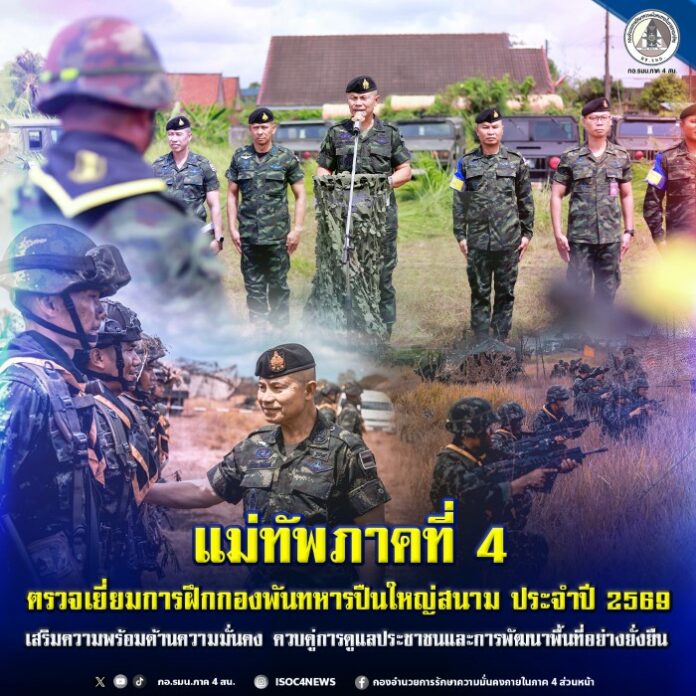 เมื่อวันที่ 5 กุมภาพันธ์ 2569 เวลา 09.00 น. ณ พื้นที่การฝึกบ้านท่าซัก อำเภอเมือง จังหวัดนครศรีธรรมราช พลโท นรธิป โพยนอก แม่ทัพภาคที่ 4 / ผู้อำนวยการรักษาความมั่นคงภายในภาค 4 พร้อมคณะผู้บังคับบัญชา เดินทางลงพื้นที่ตรวจเยี่ยมและสังเกตการณ์การฝึกและประเมินผลการฝึกเป็นหน่วยกองพันทหารปืนใหญ่สนาม ประจำปี 2569 ของกองพันทหารปืนใหญ่ที่ 25 กรมทหารปืนใหญ่ที่ 5 เพื่อประเมินความพร้อมรบ เสริมสร้างประสิทธิภาพการปฏิบัติงาน และสร้างขวัญกำลังใจแก่กำลังพล การตรวจเยี่ยมในครั้งนี้ สะท้อนถึงความมุ่งมั่นของกองทัพบกในการพัฒนาศักยภาพกำลังพลให้มีความพร้อมทั้งด้านยุทธวิธี เทคโนโลยี และการปฏิบัติการด้านความมั่นคง เพื่อให้สามารถปกป้องอธิปไตยของชาติ ควบคู่กับการดูแลความปลอดภัยและความสงบเรียบร้อยของประชาชนในพื้นที่อย่างมีประสิทธิภาพ