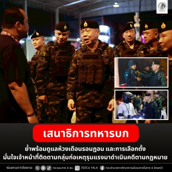 พลเอก ชัยพฤกษ์ ด้วงประพัฒน์ เสนาธิการทหารบก / เลขาธิการกองอำนวยการรักษาความมั่นคงภายในราชอาณาจักรเดินทางลงพื้นที่จังหวัดปัตตานี เพื่อพบปะให้กำลังใจกำลังพล พร้อมติดตามความคืบหน้าและแนวทางการปฏิบัติภารกิจแก้ไขปัญหาในพื้นที่ของแต่ละหน่วย โดยมี พลโท นรธิป โพยนอก แม่ทัพภาคที่ 4 / ผู้อำนวยการรักษาความมั่นคงภายในภาค 4 พร้อมด้วยคณะผู้บังคับบัญชา และกำลังพลให้การต้อนรับ