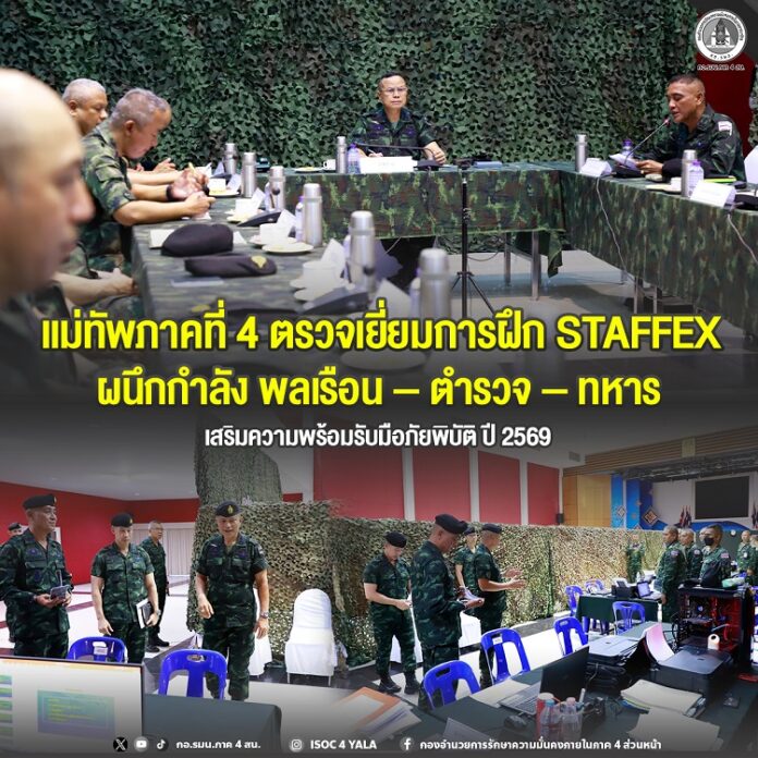 เมื่อวันที่ 5 กุมภาพันธ์ 2569 เวลา 11.30 น. พลโท นรธิป โพยนอก แม่ทัพภาคที่ 4 / ผู้อำนวยการรักษาความมั่นคงภายในภาค 4 พร้อมคณะ ลงพื้นที่ตรวจเยี่ยมการฝึกฝ่ายเสนาธิการ (STAFFEX) ภายใต้กรอบการฝึกปฏิบัติการร่วม พลเรือน ตำรวจ ทหาร ประจำปีงบประมาณ 2569 (กฝร.พตท.69 ภูมิภาค) ณ ห้องสถาพร สโมสรรื่นฤดี ค่ายวชิราวุธ จังหวัดนครศรีธรรมราช โดยมี พันเอก ปองเชษฐ์ พูนช่วย เสนาธิการมณฑลทหารบกที่ 41 พร้อมคณะฝ่ายอำนวยการศูนย์ปฏิบัติการมณฑลทหารบกที่ 41 ให้การต้อนรับ