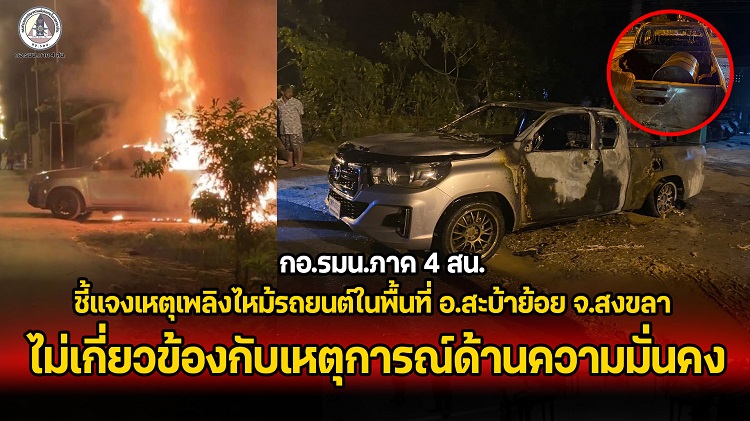 เมื่อวันที่ 6 กุมภาพันธ์ 2569 เวลาประมาณ 19.50 น. ได้เกิดเหตุเพลิงไหม้รถยนต์ในพื้นที่ตำบลคูหา อำเภอสะบ้าย้อย จังหวัดสงขลา เจ้าหน้าที่สายตรวจได้เข้าตรวจสอบที่เกิดเหตุโดยทันที พบรถยนต์กระบะถูกเพลิงไหม้เสียหายทั้งคัน