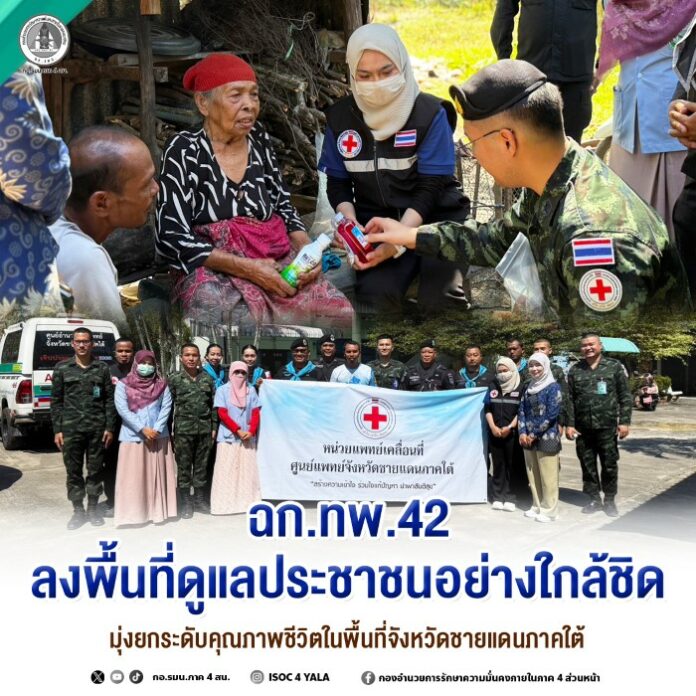 เมื่อวันที่ 6 กุมภาพันธ์ 2569 เวลา 08.00 น. หน่วยเฉพาะกิจกรมทหารพรานที่ 42 จัดกำลังพลชุดปฏิบัติการกิจการพลเรือน ร่วมกับ ศูนย์แพทย์จังหวัดชายแดนภาคใต้ และหน่วยงานในพื้นที่ จัดกิจกรรมหน่วยแพทย์เคลื่อนที่ เพื่อดูแลสุขภาพประชาชนและผู้สูงอายุในชุมชนอย่างทั่วถึง ซึ่งได้รับความร่วมมือจากเจ้าหน้าที่โรงพยาบาลส่งเสริมสุขภาพตำบลพ่อมิ่ง ปลัดประจำตำบล ผู้นำท้องที่ และผู้นำท้องถิ่น ร่วมให้บริการตรวจสุขภาพ ตรวจวัดความดันโลหิต พร้อมมอบยาสามัญประจำบ้าน เพื่ออำนวยความสะดวกและเพิ่มโอกาสการเข้าถึงบริการด้านสาธารณสุขให้แก่ประชาชนในพื้นที่ ลดภาระค่าใช้จ่าย และสร้างความอุ่นใจในการดูแลสุขภาพของตนเองและครอบครัว