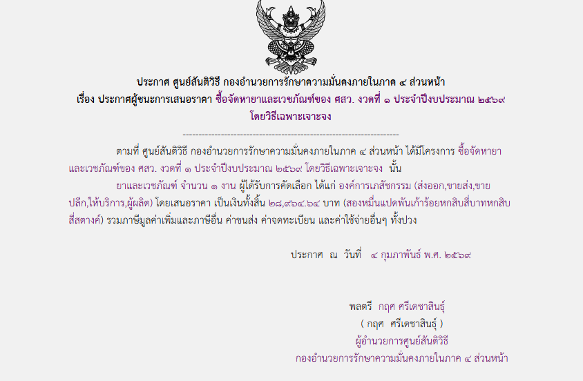 ประกาศผู้ชนะการเสนอราคา ซื้อจัดหายาและเวชภัณฑ์ของ ศสว. งวดที่ ๑ ประจำปีงบประมาณ ๒๕๖๙ โดยวิธีเฉพาะเจาะจง