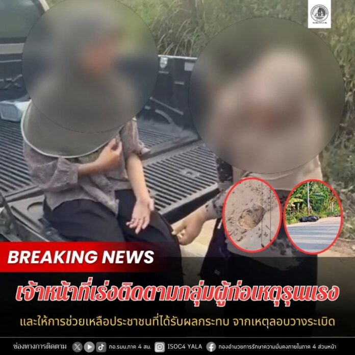 ทั้งนี้ เจ้าหน้าที่ฝ่ายความมั่นคง พร้อมชุดพิสูจน์หลักฐาน ลงพื้นที่ตรวจสอบจุดเกิดเหตุอย่างละเอียด เพื่อเก็บพยานหลักฐานทางนิติวิทยาศาสตร์และตรวจสอบกล้องวงจรปิดในพื้นที่ใกล้เคียง ในเหตุการณ์ดังกล่าว กองอำนวยการรักษาความมั่นคงภายในภาค 4 ส่วนหน้า ขอความร่วมมือพี่น้องประชาชนหากพบเห็นเบาะแสสิ่งผิดปกติ สามารถแจ้งได้ที่สายด่วน กอ.รมน.ภาค 4 ส่วนหน้า โทร 1341 หรือหน่วยเฉพาะกิจในพื้นที่ได้ตลอด 24 ชั่วโมง