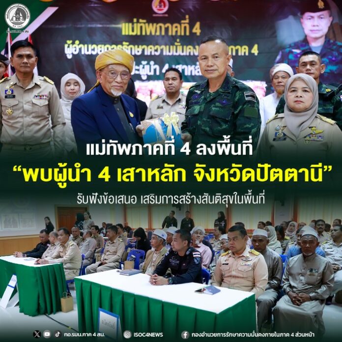 วันนี้ (7 กุมภาพันธ์ 2569) เวลา 10.00 น. ที่สำนักงานคณะกรรมการอิสลามประจำจังหวัดปัตตานี ตำบลบ่อทอง อำเภอหนองจิก จังหวัดปัตตานี พลโท นรธิป โพยนอก แม่ทัพภาคที่ 4 / ผู้อำนวยการรักษาความมั่นคงภายในภาค 4 เป็นประธานในการพบปะผู้นำ 4 เสาหลักในพื้นที่จังหวัดปัตตานี ประกอบด้วย ผู้นำศาสนา ผู้นำท้องที่ ผู้นำท้องถิ่น และผู้นำทางธรรมชาติ เพื่อรับฟังความคิดเห็น ข้อเสนอแนะ และแลกเปลี่ยนแนวทางการขับเคลื่อนการปฏิบัติงานด้านความมั่นคง ภารกิจ และนโยบายต่าง ๆ ของกองอำนวยการรักษาความมั่นคงภายในภาค 4 ส่วนหน้า ประจำปีงบประมาณ 2569 โดยมี พลตรี ณรงค์ ตันติสิทธิพร ผู้บังคับหน่วยเฉพาะกิจปัตตานี , นายอำเภอในจังหวัดปัตตานีทั้ง 12 อำเภอ , ผู้แทนหน่วยงานที่เกี่ยวข้อง , ผู้นำศาสนา และผู้นำในพื้นที่เข้าร่วมอย่างพร้อมเพรียง โดยภายในงานได้เปิดโอกาสให้ทุกภาคส่วนสะท้อนปัญหา อุปสรรค ตลอดจนข้อเสนอแนะในการปฏิบัติงานในพื้นที่