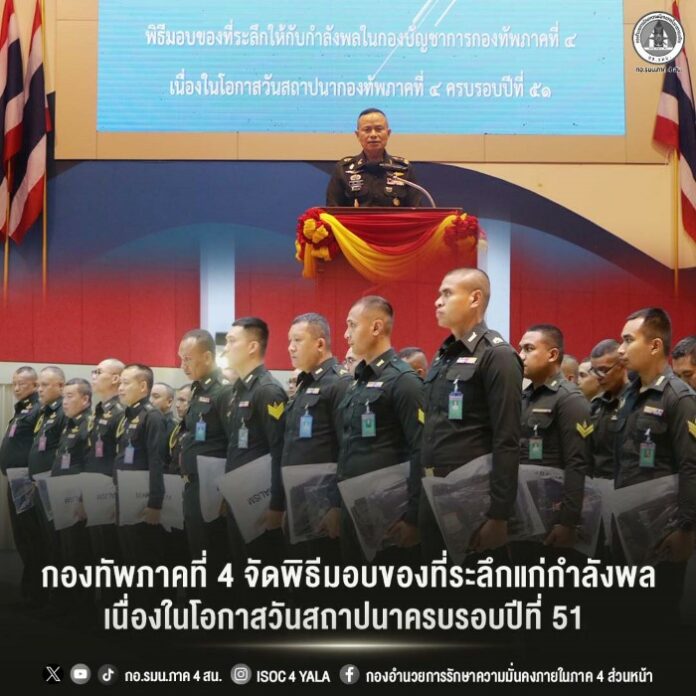 วันที่ 10 กุมภาพันธ์ 2569 เวลา 15.00 น. ณ สโมสรรื่นฤดี ค่ายวชิราวุธ อำเภอเมือง จังหวัดนครศรีธรรมราช พลโท นรธิป โพยนอก แม่ทัพภาคที่ 4 / ผู้อำนวยการรักษาความมั่นคงภายในภาค 4 เป็นประธานในพิธีมอบของที่ระลึกแก่กำลังพลในกองบัญชาการกองทัพภาคที่ 4 เนื่องในโอกาสวันสถาปนากองทัพภาคที่ 4 ครบรอบปีที่ 51 เพื่อเป็นขวัญและกำลังใจ รวมถึงแสดงความห่วงใยต่อกำลังพลผู้ปฏิบัติหน้าที่ด้วยความเสียสละและทุ่มเท