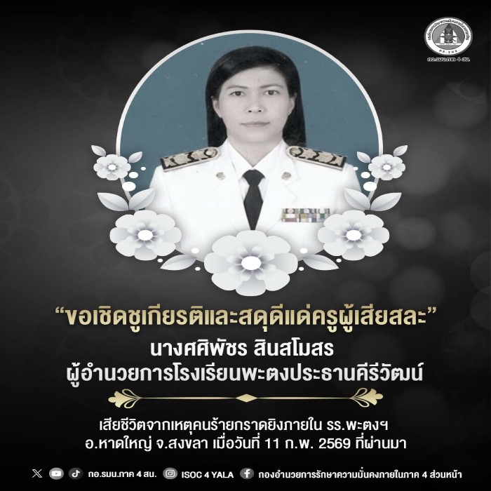 กองอำนวยการรักษาความมั่นคงภายในภาค 4 ส่วนหน้า ขอเชิดชูเกียรติและสดุดีแด่ครูผู้เสียสละ นางศศิพัชร สินสโมสร ผู้อำนวยการโรงเรียนพะตงประธานคีรีวัฒน์ อ.หาดใหญ่ จ.สงขลา ซึ่งเสียชีวิตอย่างสงบ ณ โรงพยาบาลหาดใหญ่ เมื่อช่วงเช้ามืดของวันที่ 12 กุมภาพันธ์ 2569 หลังได้รับบาดเจ็บสาหัสจากเหตุคนร้ายบุกกราดยิงและจับตัวประกันภายในอาคารเรียน โรงเรียนพะตงประธานคีรีวัฒน์ อ.หาดใหญ่ จ.สงขลา เมื่อวันที่ 11 กุมภาพันธ์ 2569 ที่ผ่านมา