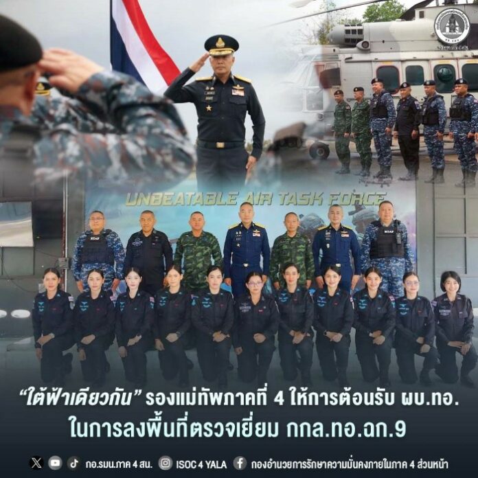 เมื่อวันที่ 11 กุมภาพันธ์ 2569 ที่ กองกำลังทางอากาศเฉพาะกิจที่ 9 ตำบลบ่อทอง อำเภอหนองจิก จังหวัดปัตตานี พลตรี ชาคริต อุจะรัตน รองแม่ทัพภาคที่ 4 / รองผู้อำนวยการรักษาความมั่นคงภายในภาค 4 ส่วนหน้า พร้อมด้วย พลตรี ณรงค์ ตันติสิทธิพร ผู้บังคับการกองพลทหารราบที่ 15 และ พันเอก หาญพล เพชรม่วง ผู้บังคับกองกำลังทหารพรานจังหวัดชายแดนภาคใต้ ร่วมให้การต้อนรับ พลอากาศเอก เสกสรรค์ คันธา ผู้บัญชาการทหารอากาศ พร้อมด้วยคณะผู้บังคับบัญชาระดับสูงจากกองทัพอากาศ ในโอกาสเดินทางลงพื้นที่ตรวจเยี่ยมการปฏิบัติงานของกองกำลังทางอากาศเฉพาะกิจที่ 9 โดยรับฟังการบรรยายสรุปผลการปฏิบัติภารกิจของหน่วย ตลอดจนปัญหาและข้อขัดข้องในการปฏิบัติงาน พร้อมทั้งหารือแนวทางการดำเนินงานในพื้นที่จังหวัดชายแดนภาคใต้ร่วมกัน