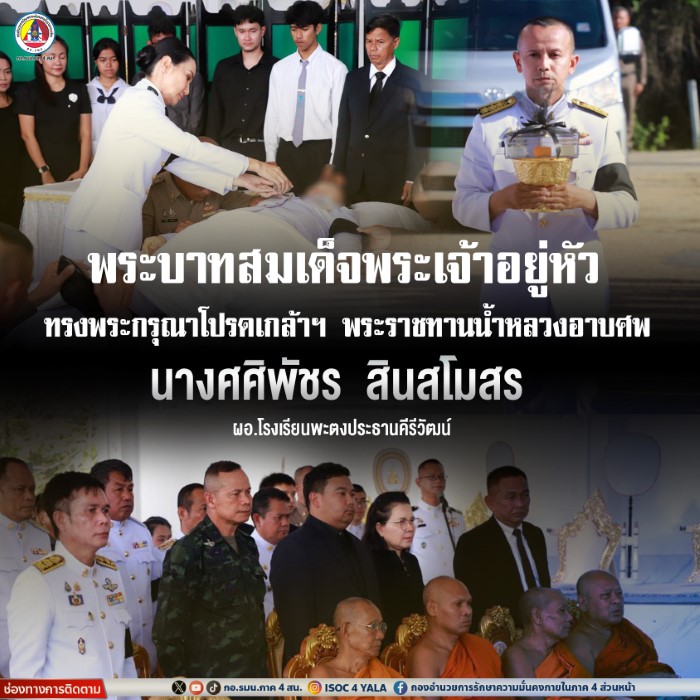 พระบาทสมเด็จพระเจ้าอยู่หัว ทรงพระกรุณาโปรดเกล้าโปรดกระหม่อม ให้ ศาสตราจารย์ ดร.นฤมล ภิญโญสินวัฒน์ รัฐมนตรีว่าการกระทรวงศึกษาธิการ เป็นประธานในพิธีพระราชทานน้ำหลวงอาบศพ พร้อมเชิญเครื่องเกียรติยศประกอบศพพระราชทาน แก่นางศศิพัชร สินสโมสร ผู้อำนวยการโรงเรียนพะตงประธานคีรีวัฒน์ ซึ่งเสียชีวิตจากเหตุการณ์เยาวชนชายวัย 18 ปี ก่อเหตุใช้อาวุธปืนภายในโรงเรียน เมื่อวันที่ 11 กุมภาพันธ์ 2569 โดยพิธีจัดขึ้นในเวลา 16.30 น. ณ ศาลาวัดยูงทอง ตำบลท่าช้าง อำเภอบางกล่ำ จังหวัดสงขลา