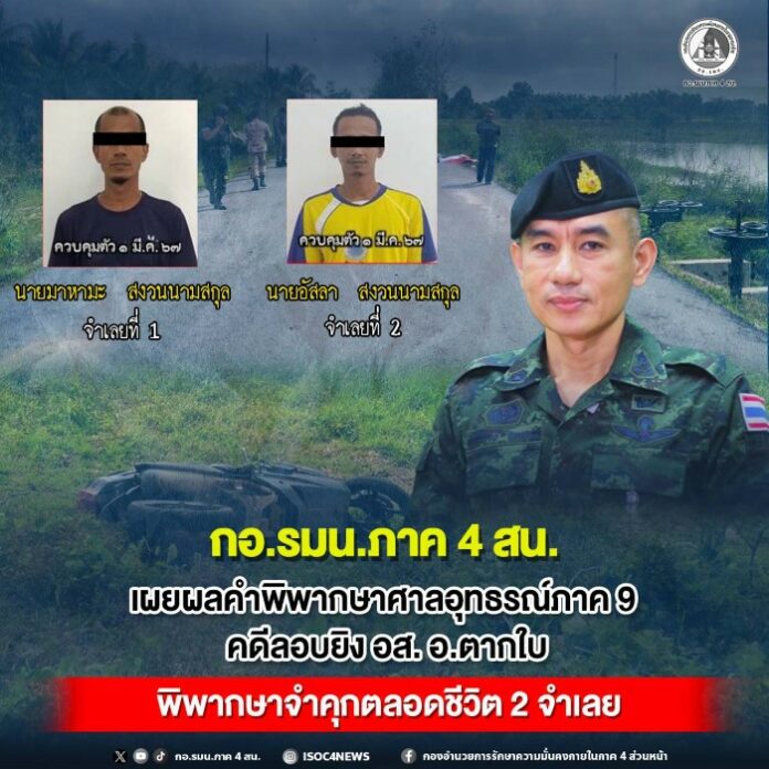 วันนี้ (13 กุมภาพันธ์ 2569) พันเอก เอกวริทธิ์ ชอบชูผล รองโฆษกกองอำนวยการรักษาความมั่นคงภายในภาค 4 ส่วนหน้า เปิดเผยว่า เมื่อวันที่ 12 กุมภาพันธ์ 2569 ศาลจังหวัดนราธิวาส ได้นัดอ่านคำพิพากษา ศาลอุทธรณ์ภาค 9 ในคดีหมายเลขดำ อ.875/2567 โดยพนักงานอัยการเป็นโจทก์ฟ้อง นายมาหะมะ (สงวนนามสกุล) จำเลยที่ 1 และนายอัสลา (สงวนนามสกุล) จำเลยที่ 2 ในคดีดังกล่าว จำเลยทั้งสองถูกฟ้องในความผิดฐานก่อการร้าย ร่วมกันสะสมกำลังพลหรืออาวุธเพื่อก่อการร้าย อั้งยี่ ซ่องโจร ปล้นทรัพย์ ฆ่าเจ้าพนักงานซึ่งกระทำการตามหน้าที่และโดยไตร่ตรองไว้ก่อน รวมถึงความผิดตามพระราชบัญญัติอาวุธปืนและวัตถุระเบิด