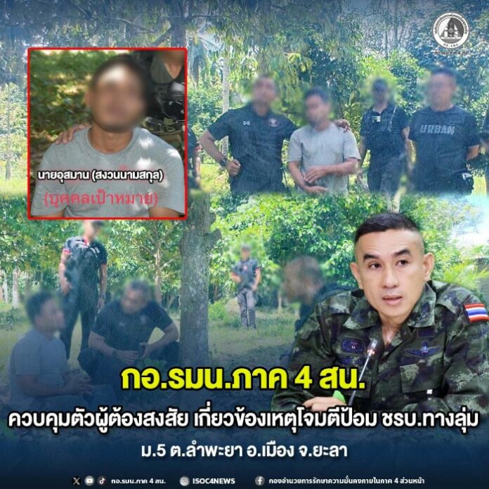 จากการตรวจสอบข้อมูลทางการข่าว พบว่าบุคคลต้องสงสัย คือ นายอุสมาน (สงวนนามสกุล) อายุ 41 ปี ซึ่งมีความเชื่อมโยงกับเหตุการณ์ดังกล่าว และมีพฤติการณ์หลบซ่อนตัวอยู่ในพื้นที่จริง