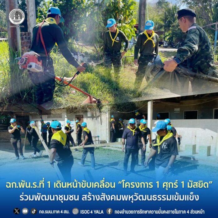 เมื่อวันที่ 13 กุมภาพันธ์ 2569 พันเอก ชัยพิพัฒน์ อินทรเทพ ผู้บังคับหน่วยเฉพาะกิจ กองพันทหารราบที่ 1 (ฉก.พัน.ร.ที่ 1) พร้อมกำลังพล ร่วมกับส่วนราชการ ผู้นำท้องที่ ผู้นำศาสนา และพี่น้องประชาชนจิตอาสาในพื้นที่ จัดกิจกรรม “โครงการ 1 ศุกร์ 1 มัสยิด” ณ มัสยิดอัลฟัดฮูลอิสลามีย์ บ้านบือราเปะ หมู่ที่ 7 ตำบลบันนังสตา อำเภอบันนังสตา จังหวัดยะลา ซึ่งเป็นสถานที่สำคัญทางศาสนาและศูนย์รวมจิตใจของพี่น้องประชาชนในพื้นที่ โดยทุกภาคส่วนได้ร่วมกันปรับปรุงภูมิทัศน์ ทำความสะอาด ซ่อมแซม และพัฒนาพื้นที่โดยรอบให้มีความเป็นระเบียบเรียบร้อย สะอาด และสวยงาม เพื่อให้ประชาชนได้ใช้ประโยชน์ร่วมกันอย่างสะดวกและปลอดภัย โดยมี นายอำเภอบันนังสตาเป็นประธานในพิธี