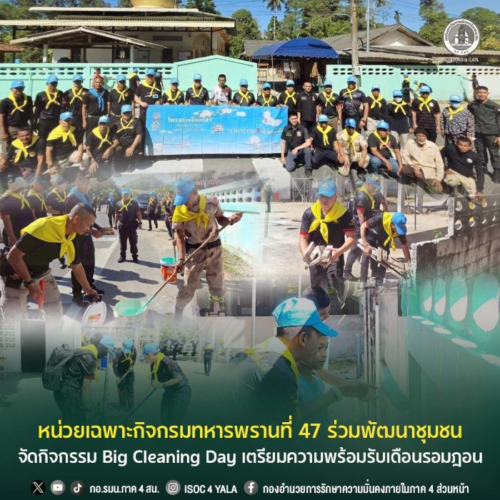 หน่วยเฉพาะกิจกรมทหารพรานที่ 47 จัดกำลังพล ร่วมกับผู้นำศาสนา และพี่น้องประชาชนในพื้นที่อำเภอยะหา , อำเภอกาบัง และอำเภอกรงปินัง จังหวัดยะลา จัดกิจกรรมจิตอาสาพัฒนาศาสนสถาน “Big Cleaning Day” ทำความสะอาดมัสยิดในพื้นที่ เพื่อเตรียมความพร้อมก่อนเข้าสู่ห้วงเทศกาลเดือนรอมฎอน ฮิจเราะห์ศักราช 1447 ซึ่งกิจกรรมดังกล่าวสะท้อนถึงความร่วมมืออันดีระหว่างเจ้าหน้าที่ภาครัฐ ผู้นำศาสนา และประชาชนในพื้นที่ ที่ต่างร่วมแรงร่วมใจกันดูแลศาสนสถานซึ่งเป็นศูนย์กลางของชุมชน ให้มีความสะอาด เป็นระเบียบ และพร้อมรองรับการประกอบศาสนกิจของพี่น้องชาวไทยมุสลิมในช่วงเดือนอันประเสริฐ