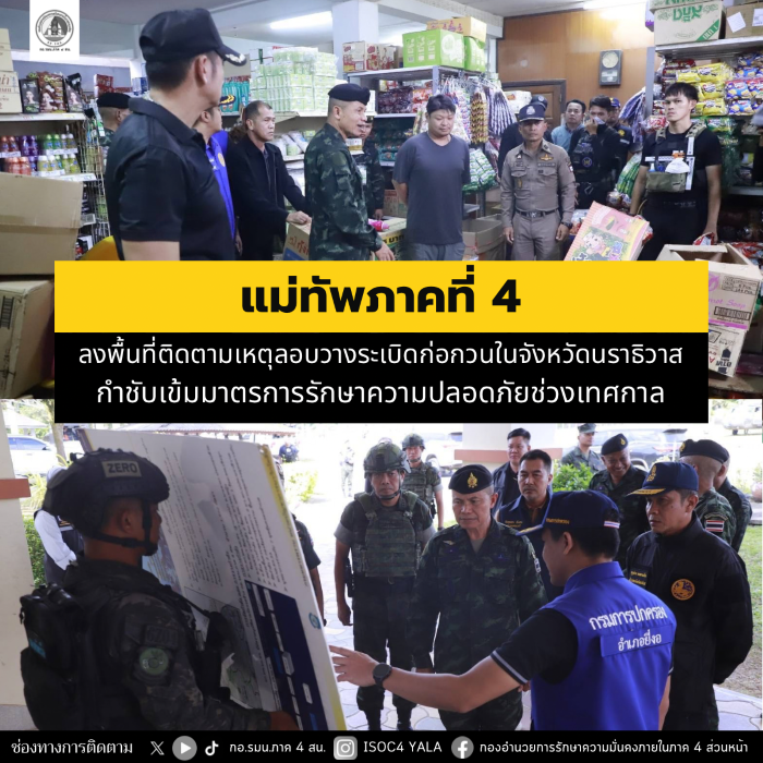 เมื่อวันที่ 15 กุมภาพันธ์ 2569 เวลา 14.00 น. พลโท นรธิป โพยนอก แม่ทัพภาคที่ 4 / ผู้อำนวยการรักษาความมั่นคงภายในภาค 4 ลงพื้นที่จังหวัดนราธิวาส เพื่อติดตามสถานการณ์เหตุลอบวางระเบิดก่อกวนที่เกิดขึ้นในหลายจุดของพื้นที่ พร้อมกำชับการปฏิบัติงานของเจ้าหน้าที่ทุกหน่วยอย่างใกล้ชิด ภายหลังเดินทางถึงพื้นที่ ได้เข้ารับฟังการบรรยายสรุปสถานการณ์ในเขตอำเภอระแงะ จังหวัดนราธิวาส จากผู้บังคับหน่วยเฉพาะกิจกรมทหารพรานที่ 45 ก่อนลงพื้นที่ตรวจสอบจุดเกิดเหตุทั้ง 3 จุดในอำเภอระแงะ เพื่อติดตามความคืบหน้าทางคดี และประเมินมาตรการรักษาความปลอดภัยในพื้นที่อย่างรอบด้าน