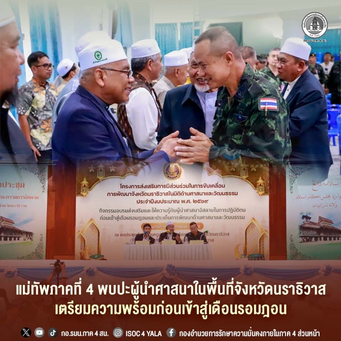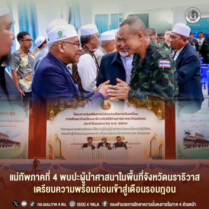 วันนี้ (16 กุมภาพันธ์ 2569) เวลา 10.30 น. ณ หอประชุมสำนักงานคณะกรรมการอิสลามประจำจังหวัดนราธิวาส อำเภอเมือง จังหวัดนราธิวาส พลโท นรธิป โพยนอก แม่ทัพภาคที่ 4 / ผู้อำนวยการรักษาความมั่นคงภายในภาค 4 พร้อมด้วย นายซาฟีอี เจ๊ะเลาะ ประธานคณะกรรมการอิสลามประจำจังหวัดนราธิวาส และ นายบุญช่วย หอมยามเย็น ผู้ว่าราชการจังหวัดนราธิวาส ร่วมพบปะผู้นำศาสนา หัวหน้าส่วนราชการ และผู้นำท้องถิ่นในพื้นที่จังหวัดนราธิวาส ในกิจกรรมส่งเสริมและให้ความรู้แก่ผู้นำศาสนาอิสลามก่อนเข้าสู่เดือนรอมฎอน โดยมี พลตรี ยอดอาวุธ พึ่งพักตร์ ผู้บังคับหน่วยเฉพาะกิจนราธิวาส และ พลตำรวจตรี ประยงค์ โคตรสาขา ผู้บังคับการตำรวจภูธรจังหวัดนราธิวาส ตลอดจนผู้นำศาสนาและมุสลิมะฮ์ในพื้นที่เข้าร่วมฯ