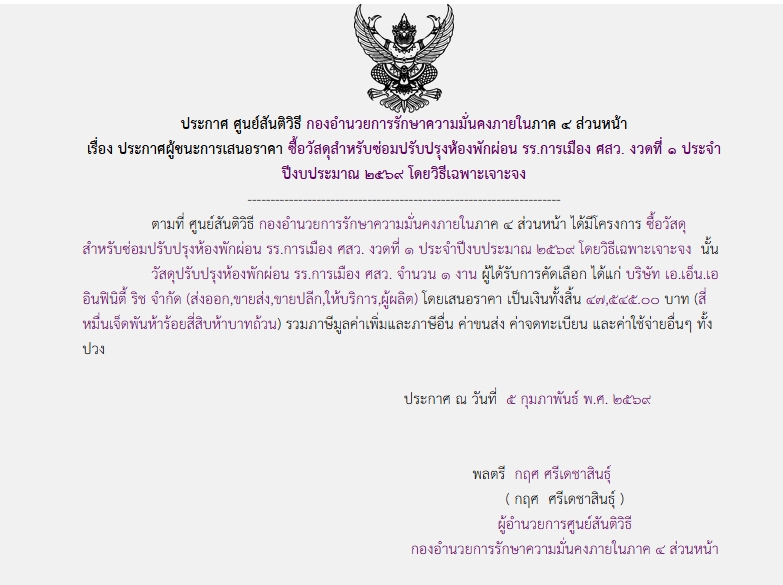 จัดซื้อ จัดจ้างประกาศผู้ชนะการเสนอราคา ประกาศผู้ชนะการเสนอราคา ซื้อวัสดุสำหรับซ่อมปรับปรุงห้องพักผ่อน รร.การเมือง ศสว. งวดที่ ๑ ประจำปีงบประมาณ ๒๕๖๙ โดยวิธีเฉพาะเจาะจง February 17, 2026 10 Share Facebook Twitter Google+ Telegram LINE