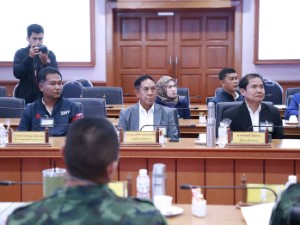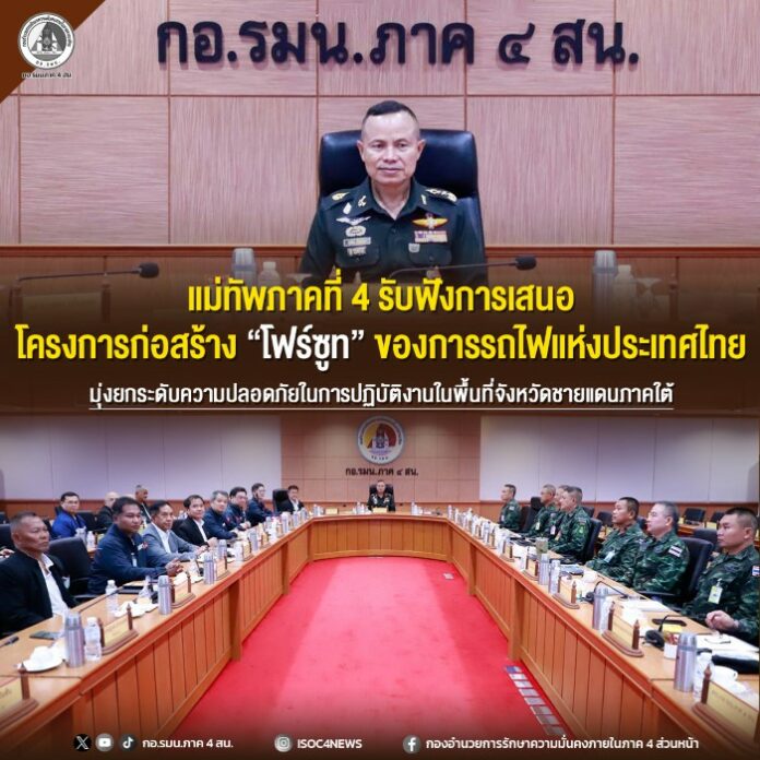 วันนี้ (18 กุมภาพันธ์ 2569) เวลา 10.30 น. ที่ห้องประชุม 1 กองอำนวยการรักษาความมั่นคงภายในภาค 4 ส่วนหน้า ค่ายสิรินธร ตำบลเขาตูม อำเภอยะรัง จังหวัดปัตตานี พลโท นรธิป โพยนอก แม่ทัพภาคที่ 4 / ผู้อำนวยการรักษาความมั่นคงภายในภาค 4 ให้การต้อนรับ พร้อมรับฟังการเสนอรายละเอียดโครงการก่อสร้าง “โฟร์ซูท” สำหรับใช้สนับสนุนการปฏิบัติงานในพื้นที่จังหวัดชายแดนภาคใต้ จากผู้แทนจากการรถไฟแห่งประเทศไทย โดยมี คณะผู้บริหาร เจ้าหน้าที่ที่เกี่ยวข้อง และผู้อำนวยการสำนักอำนวยการเข้าร่วมรับฟังอย่างพร้อมเพรียง