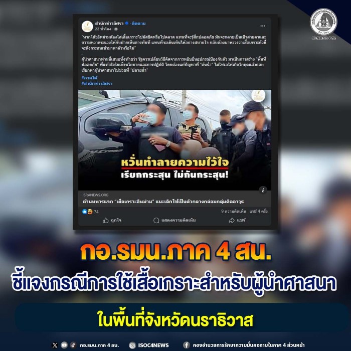 กองอำนวยการรักษาความมั่นคงภายในภาค 4 ส่วนหน้า ตระหนักถึงบทบาทอันทรงคุณค่าและความเป็นกลางของผู้นำศาสนา ในฐานะศูนย์รวมจิตใจของพี่น้องประชาชน และยืนยันว่าไม่มีนโยบายใดที่จะกระทบต่อภาพลักษณ์ ความเชื่อมั่น หรือสถานะความเป็นกลางของผู้นำศาสนาในพื้นที่อย่างเด็ดขาด