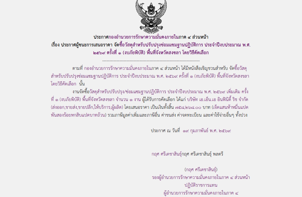 จัดซื้อ จัดจ้างประกาศผู้ชนะการเสนอราคา ประกาศ กองอํานวยการรักษาความมั่นคงภายในภาค ๔ ส่วนหน้า เรื่อง ประกาศผู้ชนะการเสนอราคา จัดซื้อวัสดุสำหรับปรับปรุง/ซ่อมแซ่มฐานปฏิบัติการ ประจำปีงบประมาณ พ.ศ. ๒๕๖๙ เพิ่มเติม ครั้งที่ ๑ (งบภัยพิบัติ) พื้นที่จังหวัดสงขลา โดยวิธีคัดเลือก February 20, 2026 17 Share Facebook Twitter Google+ Telegram LINE