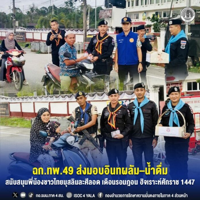 วันที่ 19 กุมภาพันธ์ 2569 หน่วยเฉพาะกิจกรมทหารพรานที่ 49 จัดกำลังพลชุดปฏิบัติการกิจการพลเรือน ร่วมกับนายอภินันท์ ชาจิตตะ นายอำเภอจะแนะ/ ผู้อำนวยการศูนย์ปฏิบัติการอำเภอจะแนะ แจกจ่ายอินทผลัมและน้ำดื่มให้กับพี่น้องประชาชนชาวไทยมุสลิมที่สัญจรผ่านจุดตรวจ ณ ด่านตรวจความมั่นคงร่วม 3 ฝ่าย (ด่านตรวจมะนังกาแยง) อำเภอจะแนะ จังหวัดนราธิวาส เพื่อนำไปรับประทานในช่วงละศีลอด (เปิดปอซอ) ตลอดห้วงเดือนรอมฎอน