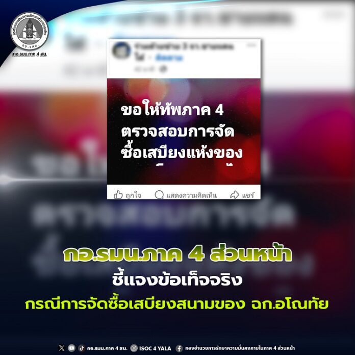 กองอำนวยการรักษาความมั่นคงภายในภาค 4 ส่วนหน้า ขอเรียนชี้แจงข้อเท็จจริงเพื่อให้พี่น้องประชาชนได้รับข้อมูลที่ถูกต้อง ดังนี้