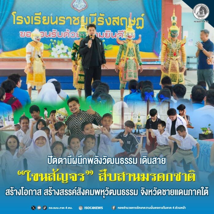 วันที่ 16 – 27 กุมภาพันธ์ 2569 จังหวัดปัตตานี โดยสำนักงานวัฒนธรรมจังหวัดปัตตานี ชมรมโขนเยาวชนชายแดนใต้ ร่วมกับโรงเรียนสายบุรี “แจ้งประชาคาร” จัดกิจกรรมเผยแพร่ประชาสัมพันธ์ศิลปะการแสดงโขนสัญจร ประจำปีงบประมาณ 2569 โครงการส่งเสริมมรดกทางวัฒนธรรมเพื่อการอนุรักษ์ และการท่องเที่ยวเชิงสร้างสรรค์ในสังคมพหุวัฒนธรรม ภายใต้โครงการสำคัญ : โครงการพัฒนาและยกระดับการท่องเที่ยวทุกด้านด้วยเศรษฐกิจสร้างสรรค์ กิจกรรมหลักที่ 1 กิจกรรมเยาวชนโขนชายแดนใต้ ณ สถานศึกษาในพื้นที่สามจังหวัดชายแดนภาคใต้ จำนวน 15 แห่ง