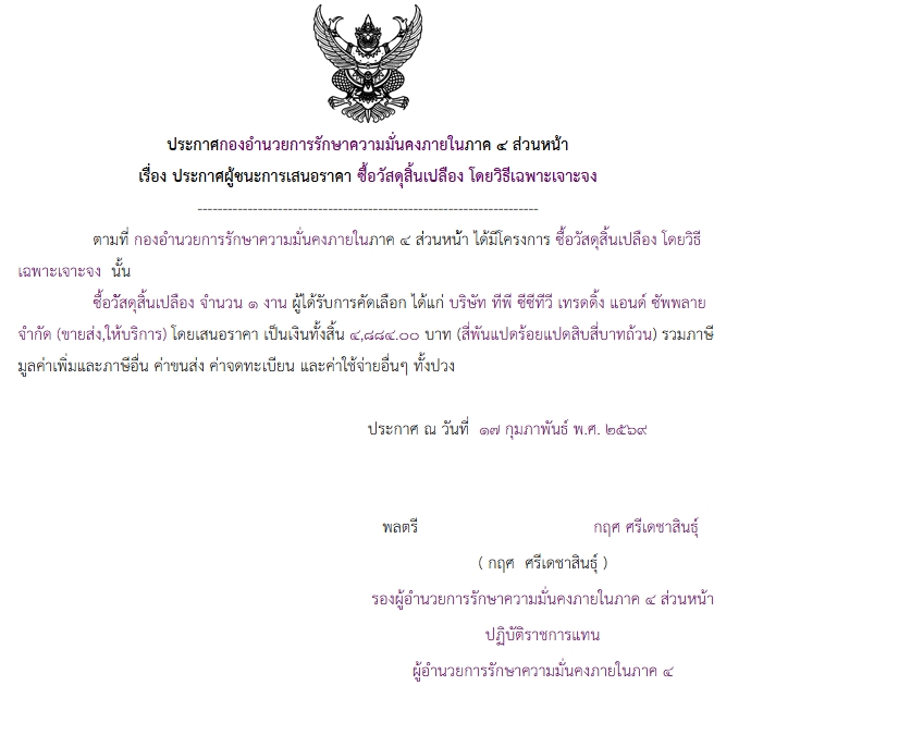 จัดซื้อ จัดจ้างประกาศผู้ชนะการเสนอราคา ประกาศ กองอํานวยการรักษาความมั่นคงภายในภาค ๔ ส่วนหน้า เรื่อง ประกาศผู้ชนะการเสนอราคา ซื้อวัสดุสิ้นเปลือง โดยวิธีเฉพาะเจาะจง February 25, 2026 6 Share Facebook Twitter Google+ Telegram LINE