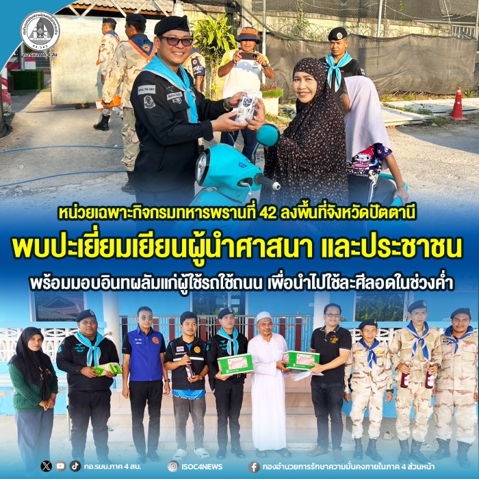 เมื่อวันที่ 24 กุมภาพันธ์ 2569 หน่วยเฉพาะกิจกรมทหารพรานที่ 42 ร่วมกับ ฝ่ายปกครอง และเจ้าหน้าที่ในพื้นที่ ลงพื้นที่พบปะเยี่ยมเยียนพี่น้องประชาชนในจังหวัดปัตตานี เพื่อเสริมสร้างความเข้าใจ ความไว้วางใจ และร่วมกันพัฒนาพื้นที่ให้เกิดความสงบสุขและมีคุณภาพชีวิตที่ดีอย่างยั่งยืน โดย ชุดปฏิบัติการกิจการพลเรือนกองร้อยทหารพรานที่ 4210 ร่วมกับ ฝ่ายปกครองอำเภอปะนาเระ และเจ้าหน้าที่ชุดคุ้มครองตำบลบ้านนอก ลงพื้นที่พบปะโต๊ะอิหม่ามประจำมัสยิดและประชาชนในพื้นที่ตำบลบ้านนอก อำเภอปะนาเระ จังหวัดปัตตานี เพื่อรับฟังปัญหา สอบถามสารทุกข์สุขดิบ และเปิดเวทีแลกเปลี่ยนความคิดเห็นเกี่ยวกับแนวทางการพัฒนาชุมชน ทั้งด้านความเป็นอยู่ ความปลอดภัย และความต้องการของประชาชนในพื้นที่ เพื่อให้การดำเนินงานของภาครัฐตอบโจทย์และสอดคล้องกับบริบทชุมชนอย่างแท้จริง