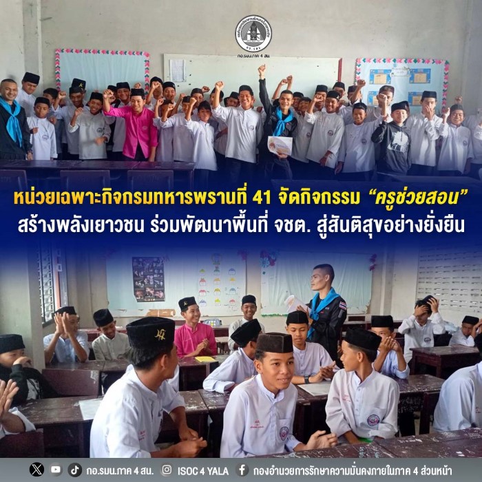เมื่อวันที่ 24 กุมภาพันธ์ 2569 เวลา 09.00 น. หน่วยเฉพาะกิจกรมทหารพรานที่ 41 จัดกำลังพลชุดปฏิบัติการกิจการพลเรือน กองร้อยทหารพรานที่ 4102 ลงพื้นที่โรงเรียนมะฮัดดะวะห์อิสลามียะห์ หมู่ที่ 5 ตำบลตะโละหะลอ อำเภอรามัน จังหวัดยะลา ดำเนินกิจกรรม “ครูช่วยสอน” ภายใต้หัวข้อ “การอยู่ร่วมกันในสังคมพหุวัฒนธรรม” โดยมุ่งเน้นการปลูกฝังให้เยาวชนมีความเข้าใจในความหลากหลายทางวัฒนธรรม ศาสนา และวิถีชีวิต สร้างทัศนคติที่ดีต่อการอยู่ร่วมกันอย่างสันติ เคารพซึ่งกันและกัน และร่วมกันพัฒนาชุมชนของตนเองให้เข้มแข็ง