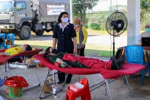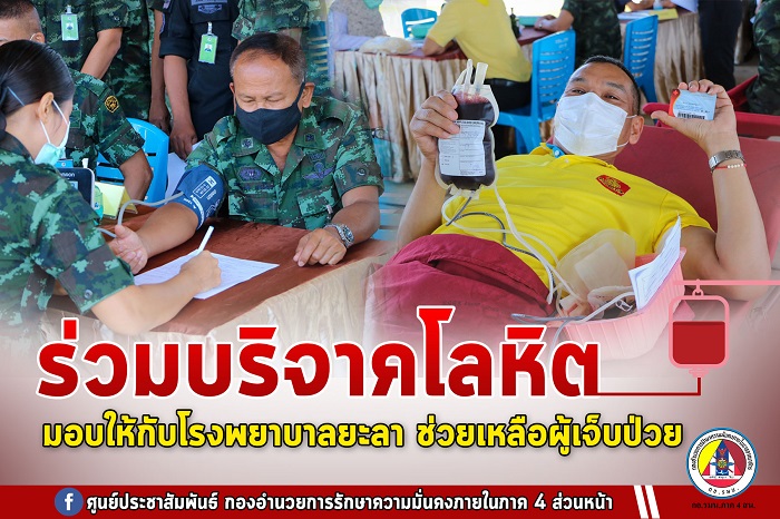 วันนี้ (15 กุมภาพันธ์ 2564) เวลา 10.00 น. ที่โรงรถ ร.152 ค่ายสิรินธร ตำบลเขาตูม อำเภอยะรัง จังหวัดปัตตานีเหล่ากาชาดจังหวัดยะลา ร่วมกับโรงพยาบาลยะลา นำเจ้าหน้าที่ เปิดรับบริจาคโลหิต โดยขอความร่วมมือจากกำลังพลที่ปฏิบัติงานภายในกองอำนวยการรักษาความมั่นคงภายในภาค 4 ส่วนหน้า และครอบครัวของกำลังพลค่ายสิรินธร ร่วมบริจาคโลหิต เพื่อนำไปมอบให้กับโรงพยาบาล สืบเนื่องจากจากสถานการณ์การแพร่ระบาดของโรคติดเชื้อไวรัสโคโรน่า 2019 ระลอกใหม่ ทำให้มีผู้บริจาคโลหิตลดลงอย่างต่อเนื่อง ส่งผลให้โลหิตสำรองของสภากาชาดไทยและโรงพยาบาลทั่วประเทศขาดแคลนอย่างหนัก เหล่ากาชาดจังหวัดจึงขอความร่วมมือเชิญกำลังพล เจ้าหน้าที่และครอบครัว รวมถึงผู้บริจาคโลหิตรายเก่าให้บริจาคทุก 3 เดือน เพื่อเพิ่มปริมาณโลหิตสำรองให้เพียงพอต่อการใช้งาน ซึ่งการเปิดรับบริจาคโลหิตในครั้งนี้ ได้รับความสนใจจากทหาร บุคลากรของกองอำนวยการรักษาความมั่นคงภายในภาค 4 ส่วนหน้า สำหรับโลหิตที่ได้รับบริจาคในวันนี้ จะได้ส่งมอบให้กับโรงพยาบาลยะลา เพื่อนำไปใช้ช่วยเหลือผู้เจ็บป่วยทั่วไป และผู้เจ็บป่วยจากสถานการณ์ความไม่สงบในพื้นที่ต่อไป