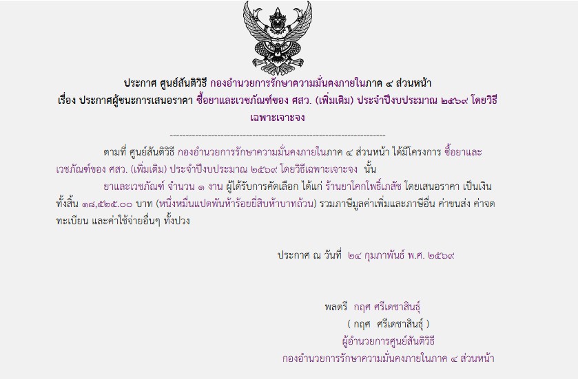 จัดซื้อ จัดจ้างประกาศผู้ชนะการเสนอราคา ประกาศ ศูนย์สันติวิธี กองอํานวยการรักษาความมั่นคงภายในภาค ๔ ส่วนหน้า เรื่อง ประกาศผู้ชนะการเสนอราคา ซื้อยาและเวชภัณฑ์ของ ศสว. (เพิ่มเติม) ประจำปีงบประมาณ ๒๕๖๙ โดยวิธีเฉพาะเจาะจง February 26, 2026 8 Share Facebook Twitter Google+ Telegram LINE
