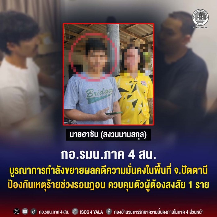 กองอำนวยการรักษาความมั่นคงภายในภาค 4 ส่วนหน้า ยืนยันว่า การปฏิบัติทุกขั้นตอนเป็นไปตามกรอบกฎหมายและหลักสิทธิมนุษยชน อย่างเคร่งครัด มุ่งป้องกันเหตุร้าย ลดความสูญเสียต่อชีวิตและทรัพย์สินของประชาชน และสร้างความมั่นใจให้พี่น้องประชาชนสามารถประกอบศาสนกิจในช่วงเดือนรอมฎอนได้อย่างปลอดภัย