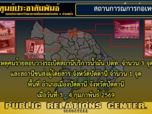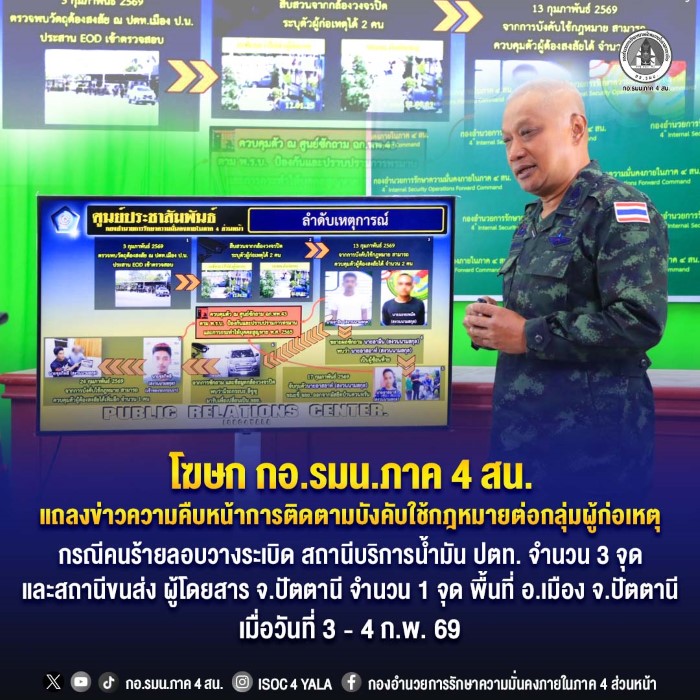 วันนี้ (27 กุมภาพันธ์ 2569) เวลา 10.00 น. พันเอก ยุทธนาม เพชรม่วง โฆษกกองอำนวยการรักษาความมั่นคงภายในภาค 4 ส่วนหน้า เปิดเผยว่า ตามที่ได้เกิดเหตุคนร้ายลอบวางระเบิดบริเวณห้องน้ำสถานีบริการน้ำมัน ปตท. จำนวน 3 จุด และสถานีขนส่งผู้โดยสาร จังหวัดปัตตานี จำนวน 1 จุด ในพื้นที่อำเภอเมือง จังหวัดปัตตานี เมื่อวันที่ 3 – 4 กุมภาพันธ์ 2569 นั้น