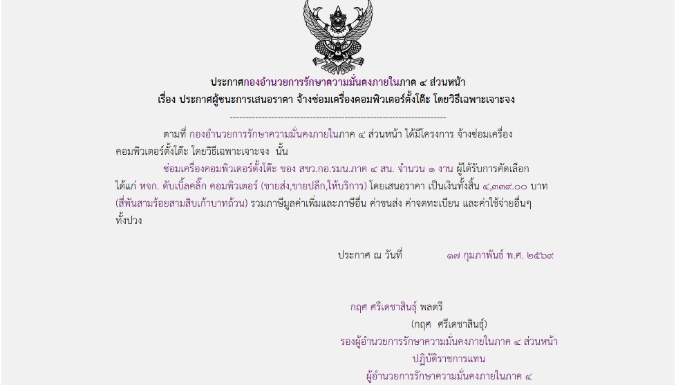 ประกาศผู้ชนะการเสนอราคา จ้างซ่อมเครื่องคอมพิวเตอร์ตั้งโต๊ะ โดยวิธีเฉพาะเจาะจง