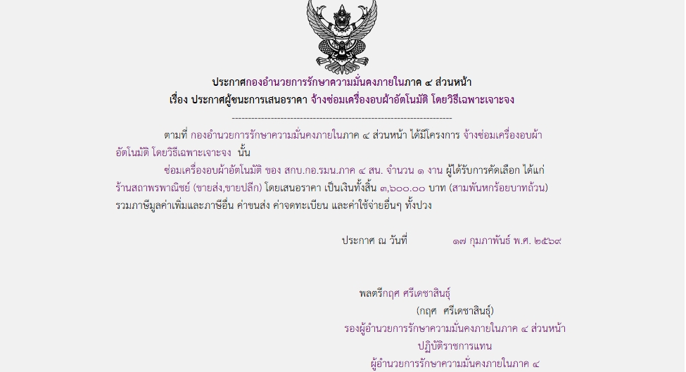 ประกาศผู้ชนะการเสนอราคา จ้างซ่อมเครื่องอบผ้าอัตโนมัติ โดยวิธีเฉพาะเจาะจง