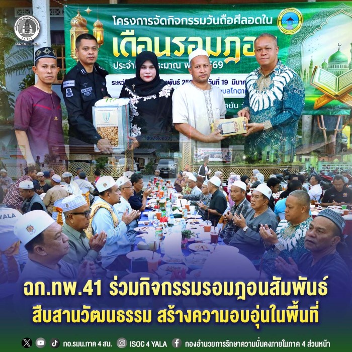 วันที่ 28 กุมภาพันธ์ 2569 เวลา 18.00 น. พันเอก จตุพร ธานีพัฒน์ ผู้บังคับหน่วยเฉพาะกิจกรมทหารพรานที่ 41 พร้อมด้วยกำลังพลของหน่วยฯ เข้าร่วมกิจกรรม “รอมฎอนสัมพันธ์ (ละศีลอด)” ประจำปีฮิจเราะห์ศักราช 1447 เพื่อสืบสานคุณค่าทางศาสนาและวัฒนธรรมอันงดงามของพี่น้องชาวไทยมุสลิมในพื้นที่ โดยมี นายกิตติภณ เปรมรัชชานนท์ นายอำเภอรามัน ให้เกียรติเป็นประธานในพิธี ณ ที่ทำการกำนัน บ้านบาโงตาแย หมู่ที่ 3 ตำบลโกตาบารู อำเภอรามัน จังหวัดยะลา