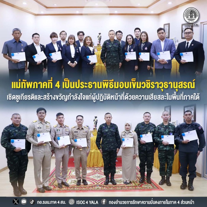 วันที่ 2 มีนาคม 2569 ณ ห้องรับรอง กองอำนวยการรักษาความมั่นคงภายในภาค 4 ส่วนหน้า ค่ายสิรินธร ตำบลเขาตูม อำเภอยะรัง จังหวัดปัตตานี พลโท นรธิป โพยนอก แม่ทัพภาคที่ 4 / ผู้อำนวยการรักษาความมั่นคงภายในภาค 4 เป็นประธานในพิธีมอบเข็มวชิราวุธานุสรณ์ พร้อมประกาศนียบัตร เบื้องหน้าพระบรมรูปพระบาทสมเด็จพระมงกุฎเกล้าเจ้าอยู่หัว รัชกาลที่ 6 ให้แก่ข้าราชการสังกัดกองทัพภาคที่ 4 รวมถึงข้าราชการพลเรือน และบุคคลที่สร้างคุณประโยชน์แก่กองทัพภาคที่ 4 และส่วนรวม จำนวนทั้งสิ้น 34 ราย โดยมีคณะผู้บังคับบัญชา ทหาร ตำรวจ และส่วนราชการเข้าร่วมพิธีอย่างพร้อมเพรียง เพื่อเป็นการเชิดชูเกียรติและสร้างขวัญกำลังใจแก่ผู้ปฏิบัติหน้าที่ด้วยความเสียสละในพื้นที่ภาคใต้
