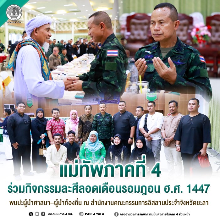 วันนี้ (2 มีนาคม 2569) เวลา 18.00 น. ที่สำนักงานคณะกรรมการอิสลามประจำจังหวัดยะลา อำเภอเมือง จังหวัดยะลา พลโท นรธิป โพยนอก แม่ทัพภาคที่ 4 / ผู้อำนวยการรักษาความมั่นคงภายในภาค 4 เป็นประธานเปิดกิจกรรมโครงการรอมฎอนสัมพันธ์ (ละศีลอด) เนื่องในเดือนรอมฎอน ฮิจเราะห์ศักราช 1447 เพื่อเสริมสร้างความสัมพันธ์ ความเข้าใจอันดีระหว่างหน่วยงานภาครัฐกับประชาชน บนพื้นฐานของสังคมพหุวัฒนธรรมและการอยู่ร่วมกันอย่างสันติสุข พร้อมสนับสนุนการปฏิบัติศาสนกิจของพี่น้องชาวไทยมุสลิมในห้วงเดือนอันประเสริฐ โดยมี พลตรี กรกฎ ภู่โชติ รองแม่ทัพภาคที่ 4 / รองผู้อำนวยการรักษาความมั่นคงภายในภาค 4 ส่วนหน้า, นายมูฮัมมัด ศานติภิมุข รองผู้ว่าราชการจังหวัดยะลา, นายอับดุลบาซิ เจ๊ะมะ ประธานคณะกรรมการอิสลามประจำจังหวัดยะลา, นายนิพนธ์ ชายใหญ่ ผู้ช่วยเลขาธิการ ศูนย์อำนวยการบริหารจังหวัดชายแดนภาคใต้, หัวหน้าส่วนราชการ, ผู้นำศาสนา, ผู้นำท้องถิ่น, เครือข่ายภาคประชาสังคม และประชาชนเข้าร่วมอย่างพร้อมเพรียง
