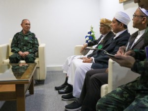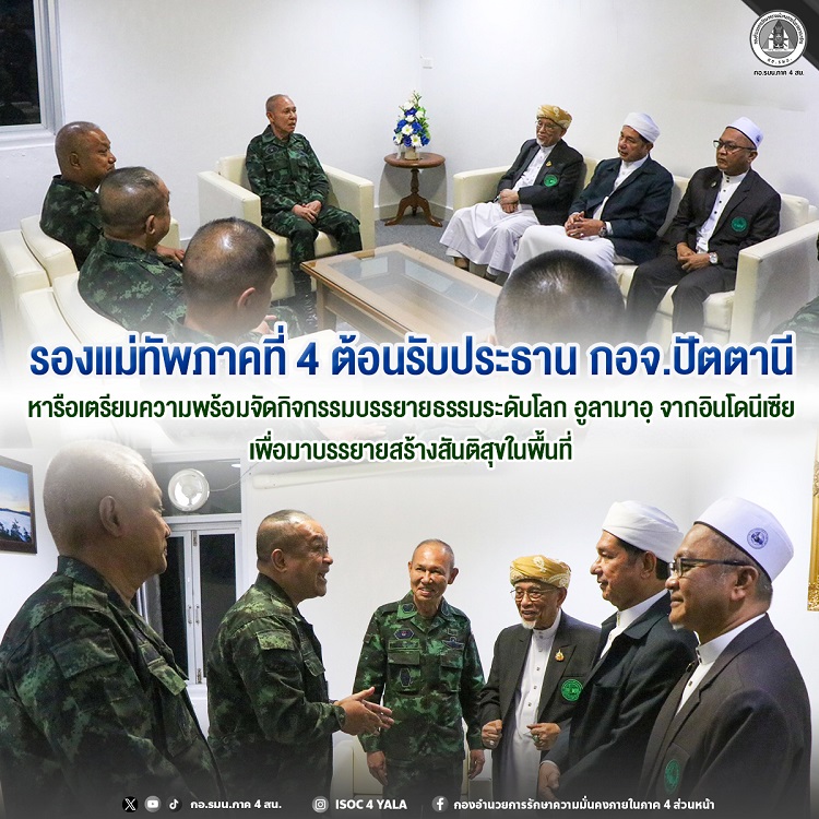 วันที่ 3 มีนาคม 2569 เวลา 10.47 น. ณ ห้องรวงผึ้ง กองอำนวยการรักษาความมั่นคงภายในภาค 4 ส่วนหน้า พลตรี กรกฎ ภู่โชติ รองแม่ทัพภาคที่ 4 / รองผู้อำนวยการรักษาความมั่นคงภายในภาค 4 ส่วนหน้า ให้การต้อนรับ นายแวดือราแม มะมิงจิ ประธานกรรมการอิสลามประจำจังหวัดปัตตานี พร้อมคณะ ในโอกาสเข้าพบเพื่อปรึกษาหารือแนวทางการประสานความร่วมมือในการจัดกิจกรรมเผยแพร่ศาสนาครั้งสำคัญ โดยมีการเชิญอูลามาอฺ จากประเทศอินโดนีเซีย เดินทางมาเยือนพื้นที่จังหวัดชายแดนภาคใต้ เพื่อมาบรรยายธรรมด้านศาสนาอิสลาม พร้อมแลกเปลี่ยนข้อมูลด้านศาสนาและสร้างความเข้าใจ นับเป็นการขับเคลื่อนกิจกรรมและเสริมสร้างความสัมพันธ์อันดีระหว่างหน่วยงานความมั่นคงและผู้นำศาสนาในพื้นที่